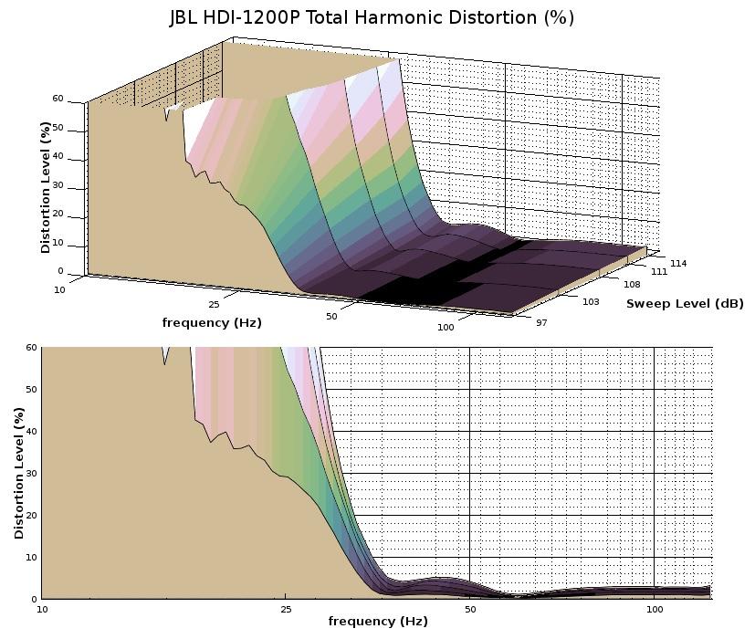 The above graphs show the corresponding total harmonic distortion to the long-term output graphs. Essentially, they depict how linear the subwoofer remains for the corresponding drive level seen in the long-term sweeps. The quantity being measured is how much of the subwoofer’s output is distortion and is shown here as a percentage. As we saw in the burst measurements, the HDI-1200P is very happy at 30Hz and above but isn’t really built for anything under 30hz. It should be kept in mind that while distortion takes off like a rocket below 30Hz, output falls like a rock below 30Hz, so any distorted output will be very far down in level relative to clean output. Take a close look at the response shape seen here, and it is essentially an inverse of the frequency response shape. So don’t think that the sub will make all kinds of distress noises if it is pushed to play deep bass since it drastically reduces all output below 30Hz. It might make some audible distortion if only fed sub-30Hz sinewave test tones, but it wouldn’t be loud in level, and in real-world use, any distorted output would be masked by the much louder signal content above 30Hz.