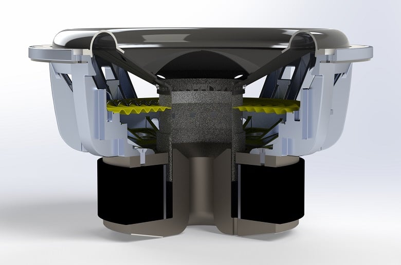 The HDI-1200P would appear to be a simple ported subwoofer on the surface, but there is more than what meets the eye. One would expect a pretty beefy driver in a $3,000 subwoofer, and the HDI-1200P does not disappoint in this regard. It has a massive motor section that is designed with what JBL calls the ‘Symmetric Field’ design. This is where the pole piece is extended above the top plate to control stray magnetic flux, which makes the magnetic field above the top plate symmetrical with the field below the top plate. A more even magnetic field on both sides of the top plate would leave the HDI-1200P with reduced odd-order harmonic distortions since the voice coil would have a more equal force on both sides of its excursion.