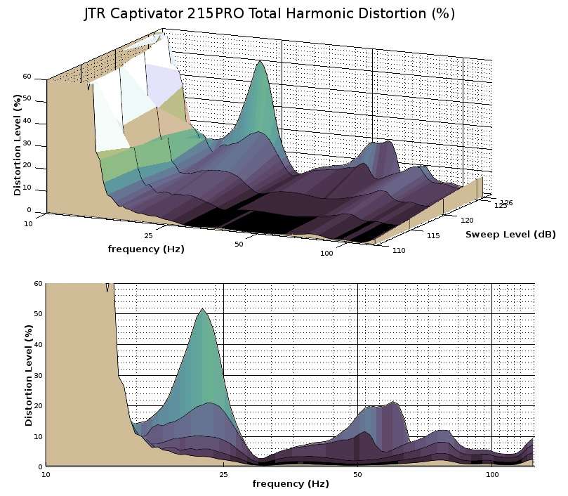 The above graphs show the corresponding total harmonic distortion to the long-term output graphs. Essentially, they depict how linear the subwoofer remains for the corresponding drive level seen in the long-term sweeps. The quantity being measured is how much of the subwoofer’s output is distortion and is shown here as a percentage. Again, a solid showing here and indicative of good engineering. Harmonic distortion pretty much stays below 10 percent within the sub’s intended range above 25 Hz until the last couple dB. Keep in mind that the lowest sweep here is the 110 dB tone. If you try to drive this sub past 125 dB distortion does spike to 20% from 50 Hz to 60 Hz, but that is the very edge of the 215PRO’s performance envelope. The highlight here for pro-audio shoppers is just how clean and unchallenged this sub is from 30 to 40 Hz, where many other common pro-audio subs would coughing up blood if attempts were made to drive them that loudly in such deep frequencies