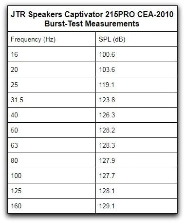 The above CEA-2010 measurements are short-term bursts that show the subwoofer’s clean peak SPL before heavy distortion sets in. Our measurements have been referenced to 2-meter RMS, which is 9 dB down from the standard requirement for the measurements to be shown at 1-meter peak. However most publicly available CEA-2010 measurements are shown at 2-meter RMS, so we followed that convention. From these measurements, we can see massive output from 25 Hz and above, averaging a staggering 127 dB above 40 Hz. That is just huge output, and it was nearly concussive to test since I wasn’t that far from the sub when running these test tones. This is well into the ‘chest-punch’ territory of SPL, and if you are close enough to the sub at those output levels, this is ‘ribcage-bruising’ territory. This easily breaks all records for mid-bass output for any subwoofer tested by Audioholics. If we are to give it a bassaholic room size rating, this easily secures an ‘Extreme’ room rating (meaning the sub is suitable for 5,000 cubic foot rooms); in fact, you could half the headroom of the Captivator 215PRO and it would still easily secure an ‘Extreme’ room rating, but that isn’t surprising since it was designed to pressurize much larger spaces than is found in a home. Brutal!