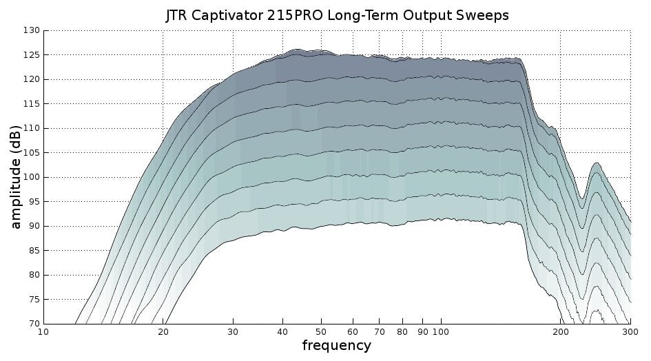 Testing for long-term output compression was done by first conducting a 20-second sweep tone where 50 Hz hit 90 dB with the subwoofer 2 meters from the microphone. We then conduct further 20-second sweeps by raising the gain by 5 dB until no more output could be wrung out of the subwoofer. These tests show us the long-term continuous headroom that the subwoofer is capable of. We can see that the Captivator 215PRO is capable of a continuous 125 dB from 40 Hz to 160 Hz. That is very good for live sound subs with such a deep tuning frequency and absolutely monstrous output relative to the subs that we normally deal with here at Audioholics. If I tried to run any sub at these loudness levels in a residential neighborhood I would earn a noise citation from police within 5 minutes. Compression behavior is quite good with not much of a response shape change from nominal output levels to maximum output levels.