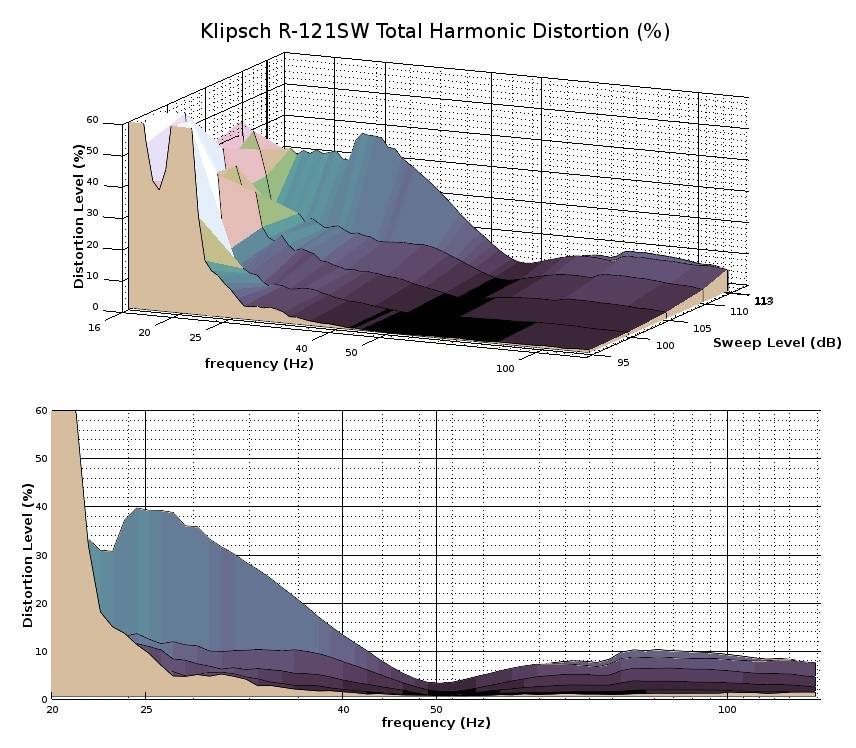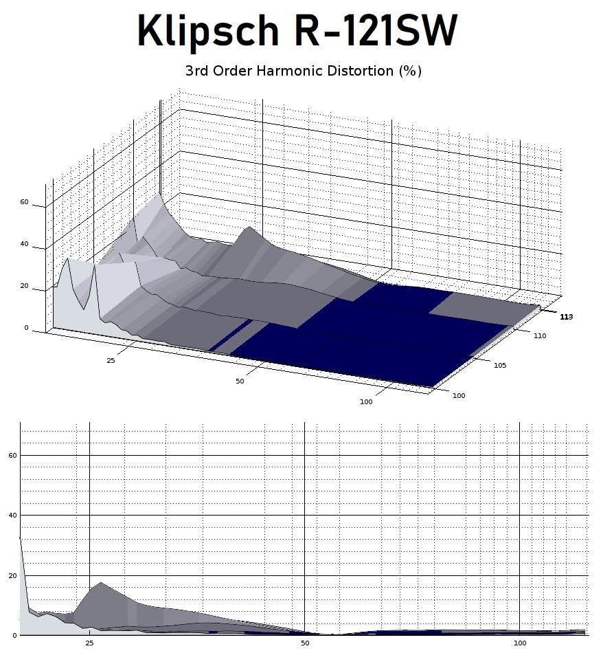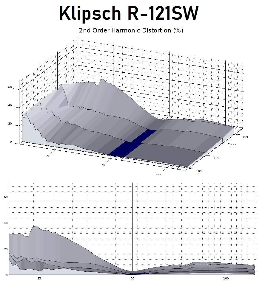 Here we can see that most of the distortion products of the R-121SW are even-order. The advantage to this is that even-order is less audible or objectionable than odd-order distortion products. The disadvantage is that it means that only one side of the driver’s motion or the signal waveform is being constricted or affected. And that means that there was probably an opportunity to iron out whatever was causing the distortion for more undistorted output. In the case of the R-121SW, I would guess that much of the even-order distortion is caused by induction effects. Induction occurs when the charged voice coil’s motion in the magnetic field creates a counter-current, but the problem is that the counter-current creates an opposing magnetic field that diminishes the initial, desired field. Induction tends to be a source of even-order distortion as well as a peakish frequency response as we see in the R-121SW. Many drivers use short-circuiting rings (often just called ‘shorting rings’) in the motor structure to address this, but it is more expensive to implement shorting rings, and I am not surprised that Klipsch decided to do without them in this lower-cost model. Shorting rings aren’t really needed for the distortion exhibited here since it is mostly at very low levels and also is of a more benign type. The rise in second-order distortion below 40Hz at the maximum drive level isn’t coming from induction but is more likely due to the moving assembly running into motor or suspension travel limits, so the inclusion of shorting rings wouldn’t help in that area. However, shorting rings would help to flatten the frequency response and increase upper-frequency sensitivity, so there are still real improvements that can be had by using them.
