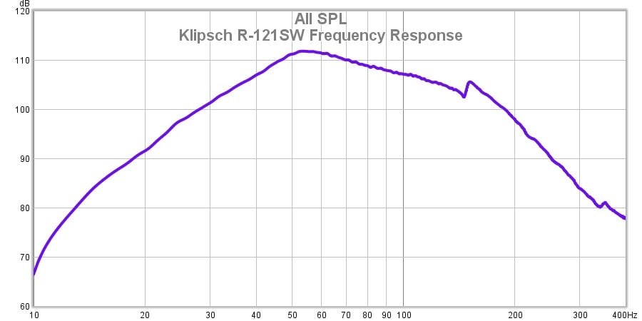 Testing on the Klipsch R-121SW was conducted with the microphone facing the woofer at a 1-meter distance with measurements scaled back to a 2-meter distance by subtracting 6dB. The temperature was recorded at 59F degrees with 70% humidity. The subwoofer’s gain was set to maximum, phase was set to zero, and the low pass filters were set to bypass.