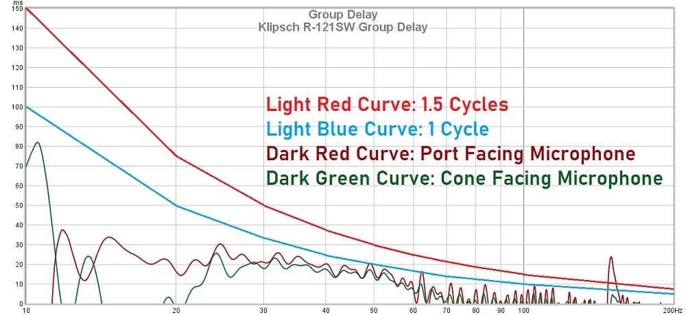 Group delay is the measurement of how much time it takes for individual frequency bands of an input signal to be produced by the speaker. It can indicate that some frequency components are developing slower than others or are taking longer to decay. It is generally thought that 1.5 sound cycles are needed for group delay to be audible at bass frequencies, although there is an argument that group delay should remain under 20ms to be completely unnoticeable, but that is likely meant for mid and upper bass frequencies.