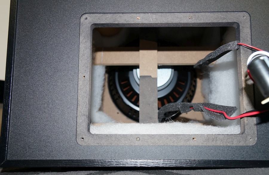 The cabinet uses ½” thick MDF side panels with a ¾” thick front baffle and a center brace to reinforce the midsections. There is polyfill lining the sides to help damp internal acoustic energy. The rear-mounted port has a 3” diameter and a 14 ½” length. It is only flared on the front. Those port dimensions suggest a relatively low tuning frequency, but we will see for sure in the performance analysis. The grille uses plastic pegs and grille guides to connect with the front. It only hides the driver but since it is just a fabric-draped frame, it wouldn’t protect the fragile cone from any heavy or fast-moving objects. The feet are some simple ⅝” tall hard rubber cylinders that get the job done.
