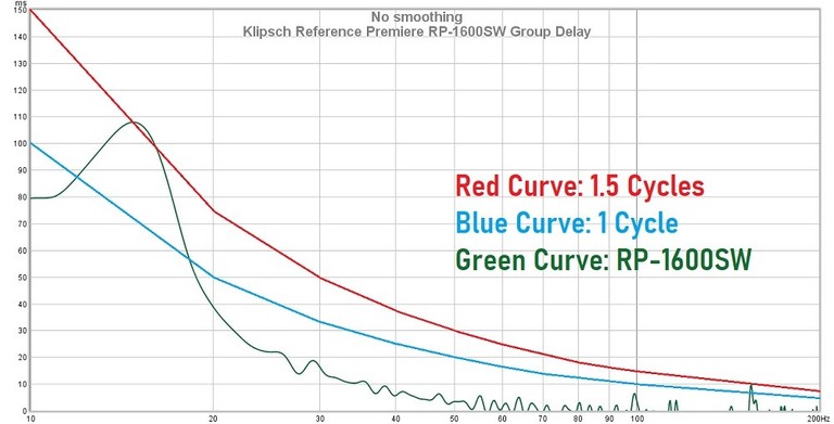 Group delay is the measurement of how much time it takes for individual frequency bands of an input signal to be produced by the speaker. It can indicate that some frequency components are developing slower than others or are taking longer to decay. It is generally thought that 1.5 sound cycles are needed for group delay to be audible at bass frequencies, although there is an argument that group delay should remain under 20ms to be completely unnoticeable, but that is likely meant for mid and upper bass frequencies.