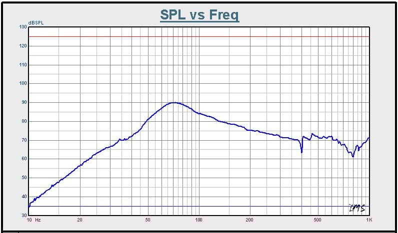 Measuring both the driver (left) and driver/cabinet (right) native impedance produced the graphs showing above. Both curves provide useful information helpful in assessing a sub. From the driver’s curve comes the collection of T/S parameters, in the table shown above right as well other clues to construction along with indications of any pathologies or anomalies, such as unwanted, excessive mechanical vibration. (Judging from the curve, there wasn’t any). From the system’s impedance curve we see the native resonance frequency (~ 48 Hz) sits at the impedance minimum (4.63 Ohms) located between the two LF peaks. With a minimum of 4.63 Ohms this sub would be classified as a 6 Ohm system.