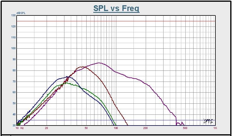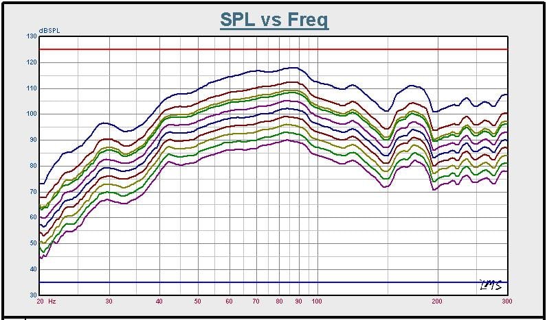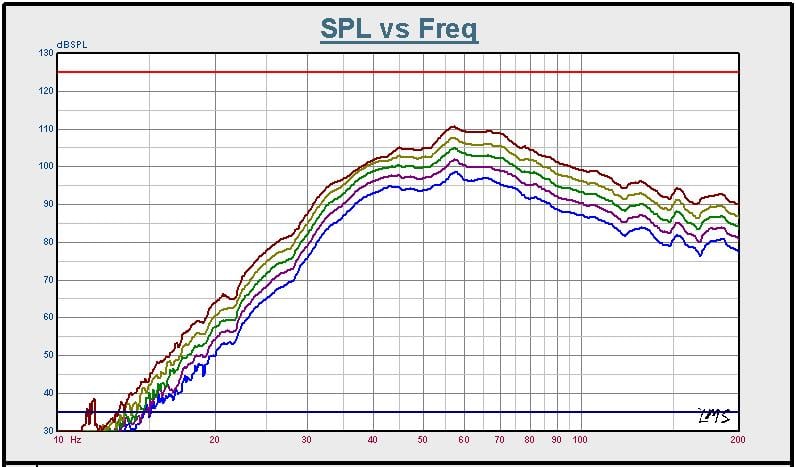 The gain of the test signal (sine wave) fed the subs LFE input was increased 3dB each sweep. The sweeps were repeated until any sort of obvious compression/limiting appeared or the sub got distorted/noisy owing to mechanical/electrical stress was noted. The spiky appearance of the curves below 20 Hz is due to random environmental noise and can be ignored. The amplitude response plots seen in the left hand graph are not smoothed; rather, a mic calibrated to eliminate room effects for use in this particular room was employed.