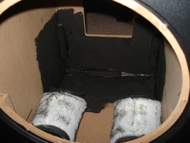 The LSP12’s cabinet is made of .75” thick MDF panels, well glued, with plenty of glue blocks in place, but no cross bracing.  The exterior of the cabinet is covered with a lightly textured black vinyl veneer. Its not a heavy -duty grade veneer, so care in handling once you’ve got the LSP12 out of its shipping cartons is in order. The interior of the cabinet is neither stuffed or lined, though the amp/driver leads and the exterior of the two ducts are wrapped. Overall, for a product in this price range, fit & finish are very good.