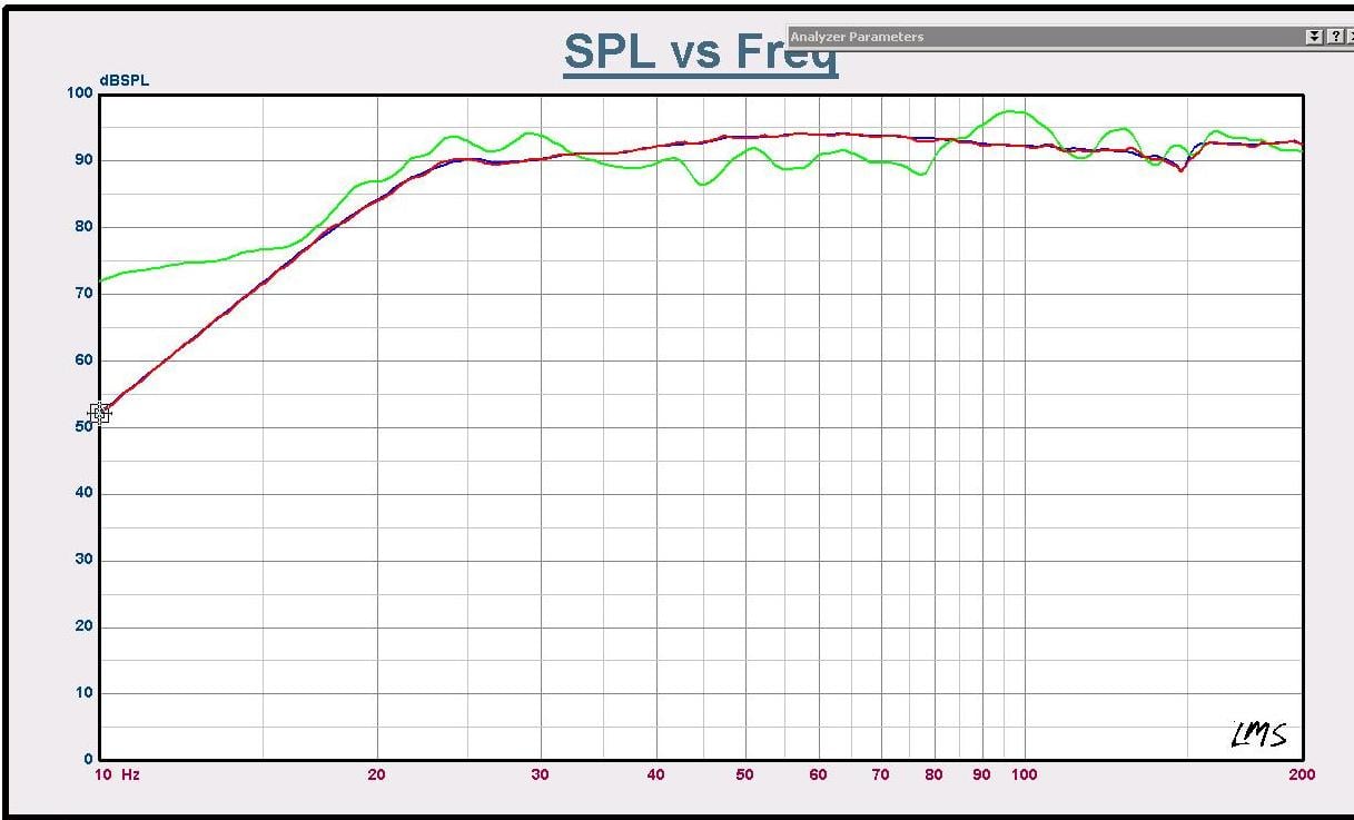 The green plot is the response of the test subwoofer as measured in the room with no custom calibration data used. The blue plot is the reference standard that is known accurate to a fraction of a dB. The red plot is the same subwoofer, measured indoors, under conditions identical to those in place at the time the green response plot was generated, but with the room effects calibrated out.