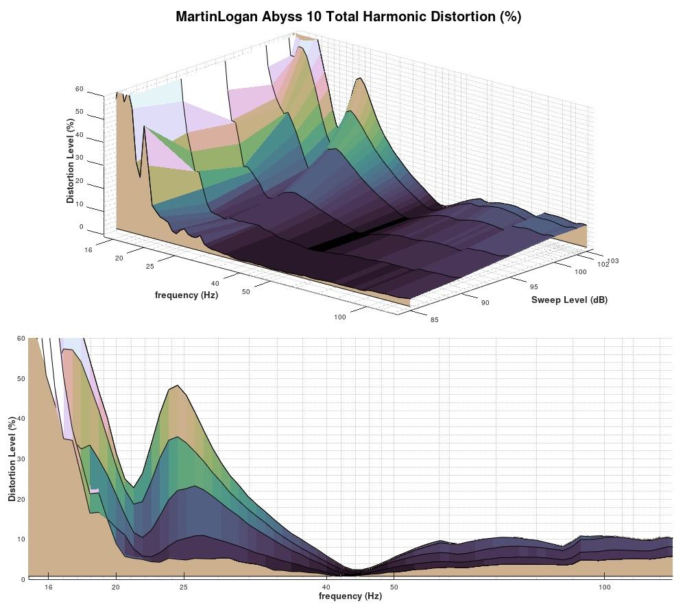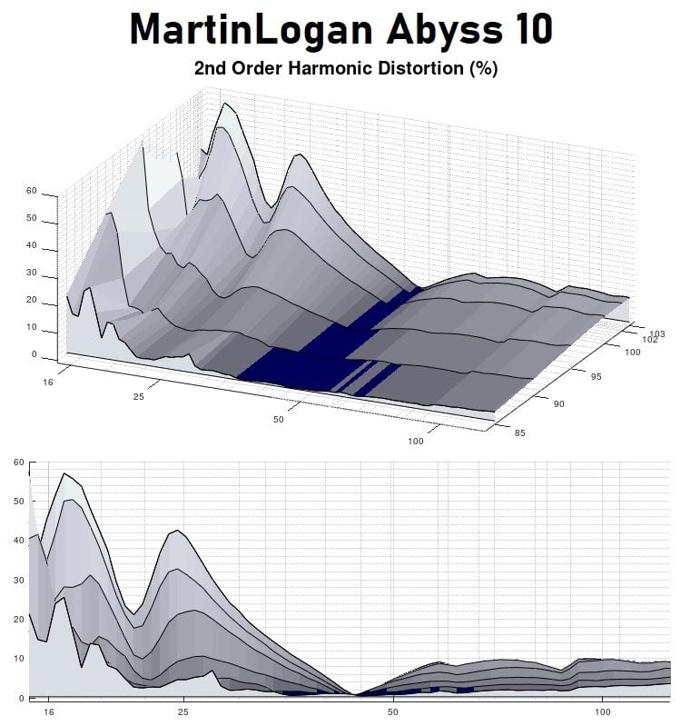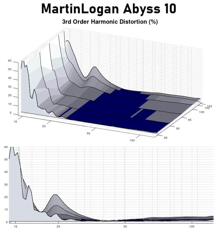 What is interesting in comparing the above graphs is that we can clearly see that the Abyss 10 errs more on the side of even-order harmonic distortion rather than odd-order. That means that whatever is causing the driver’s non-linear travel is mostly affecting one side of its excursion rather than both sides. Much of it is surely stemming from inductance, which is where a counter-current generated by the coil’s motion in the magnetic field can oppose the intended motion of the driver. I don’t know if the Abyss 10 driver uses shorting rings or a pole piece cap that could reduce inductance effects. The good news is that even-order harmonics are more subtle than odd-order harmonics, especially in music, since they can simply sound like one of the many overtones of the musical instrument itself.