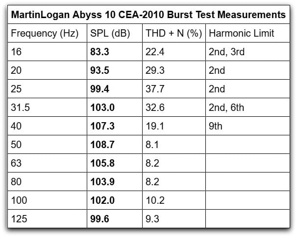 Testing on the MartinLogan Abyss 10 was conducted with the microphone facing the woofer at a 1-meter distance with measurements scaled back to a 2-meter distance by subtracting 6dB. The temperature was recorded at 60°F with 80% humidity. The subwoofer’s gain was set to maximum; the phase was set to zero, and the low-pass filters were set to bypass.