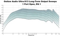 The good news from these graphs is the responses in any of the modes do not lose shape until driven to their limit. The character of sound in any program material would not substantially change throughout the majority of the Ultra-X13’s dynamic range. Furthermore, there was never a moment when the subwoofer ‘complained,’ or made any noises of mechanical distress. The driver never bottomed out nor did I hear any obvious distortion. This is significant because these tests are the toughest that are conducted for our reviews. If the Ultra-X13 could have bottomed out, it would have during this round of testing, but it didn’t. This subwoofer is very well protected against damage from high excursions.