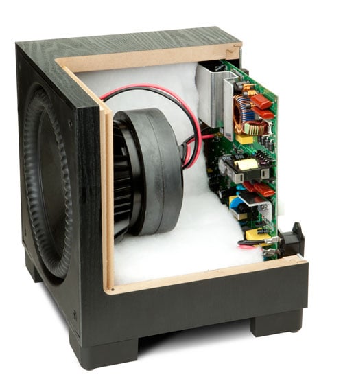 Paradigm is touting their 900 watt Class D amp in the SUB 12, though that is dynamic power. Continuous power is rated at 300 watts. From the cutout pic, we see that the enclosure is well dampened with polyfil and looks to have a very thick wall, including a double-thick baffle. In such a small box, it isn't surprising not to see an internal cross brace (there's almost no room), but corner bracing is also effective at this size.