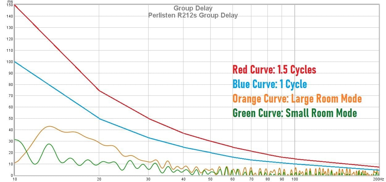Group delay is the measurement of how much time it takes for individual frequency bands of an input signal to be produced by the speaker. It can indicate that some frequency components are developing slower than others or are taking longer to decay. It is generally thought that 1.5 sound cycles are needed for group delay to be audible at bass frequencies, although there is an argument that group delay should remain under 20ms to be completely unnoticeable, but that is likely meant for mid and upper bass frequencies.