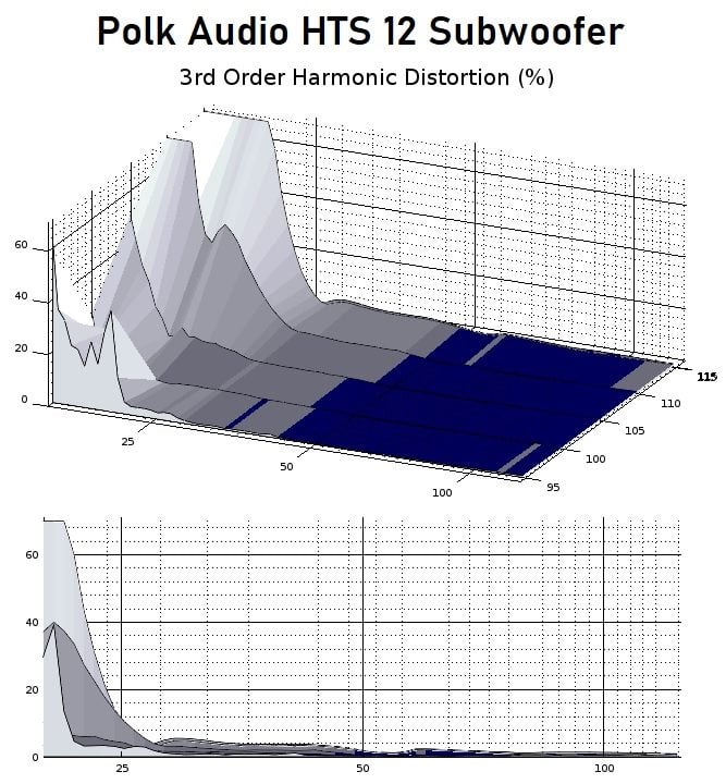 We can see from the above graphs that the distortion seen on the THD plots is largely composed of even-order products. Some of the even-order products stem from induction effects, but the lower frequency rise is much more likely due to excursion strain in the magnetic field and/or tension in the suspension. The good news is that even-order products are less audible and less objectionable than odd-order harmonics, and the HTS shows very little odd-order distortion products above 25hz. One reason why I didn’t really notice any nasty noise from the HTS 12 in outdoor testing is because even-order distortion is just less obvious and dissonant sounding than odd-order distortion. Unfortunately, having the total distortion being dominated by even-order products also means that there might have been a chance to increase total clean output a bit more since even-order distortion indicates that something was only hindering one side of the cone’s travel. It’s possible that Polk decided to give up a little bit of Xmax in favor of having even-order distortion being the dominant type on account of its less offensive nature.