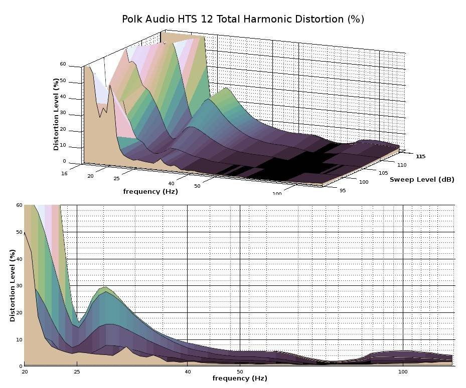 The response shape has indications of induction affecting the response. Induction occurs when the charged voice coil’s motion in the magnetic field creates a counter-current, but the problem is that the counter-current creates an opposing magnetic field that diminishes the initial, desired field. It is usually characterized by a peak in the response somewhere from 50 to 70Hz, lowered upper-frequency sensitivity, as well as a steady rise in even-order harmonic distortion products with increasing amplitude. Higher-end subs employ short-circuiting rings (frequently called ‘shorting rings’) in the motor to short out the induced current, but we don’t see shorting rings used often in subs of the HTS 12’s price range due to the increased cost. If Polk had used a shorting ring in the HTS 12 driver, we might have had a flatter response overall with more upper-bass sensitivity albeit with reduced output at the ~50Hz peak seen on this graph.