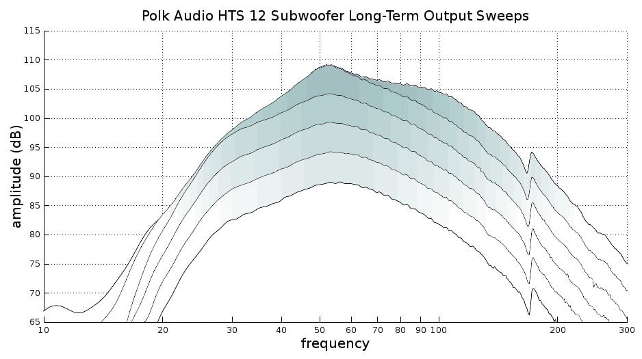 Testing for long-term output compression was done by first conducting a 20-second sweep tone where 50Hz hit 90 dB with the subwoofer 1 meter from the microphone (graph has been scaled to 2 meters for easy comparison with our other review measurements). We then conduct further 20-second sweeps by raising the gain by 5dB until no more output could be wrung out of the subwoofer. These tests show us the long-term continuous headroom that the HTS 12 is capable of. This is a respectable showing, with the HTS 12 maintaining a long-term 105dB from just above 40Hz to 100Hz. At the highest drive level, the response does become rather peakish as output below 40Hz compresses, but that only happens in the last 5dB of output. The HTS 12 holds its response shape very steady until that point.