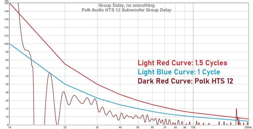 Group delay is the measurement of how much time it takes for individual frequency bands of an input signal to be produced by the speaker. It can indicate that some frequency components are developing slower than others or are taking longer to decay. It is generally thought that 1.5 sound cycles are needed for group delay to be audible at bass frequencies, although there is an argument that group delay should remain under 20ms to be completely unnoticeable, but that is likely meant for mid and upper bass frequencies.