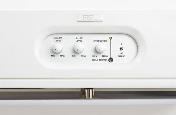 The top of the unit contains all the manual dials and switches you’d expect in a traditional sub. There’s a variable Hi/Low Level dial and an independent .1/LFE Level dial. REL claims that you can crossover the sub anywhere between 25Hz and 120Hz. However, that 25Hz number seems odd since the sub is only rated down to 30Hz at -6dB and the crossover knob lists 30Hz as its lowest setting. For phase adjustment, you can select either 0 or 180 with the flip of a toggle switch.