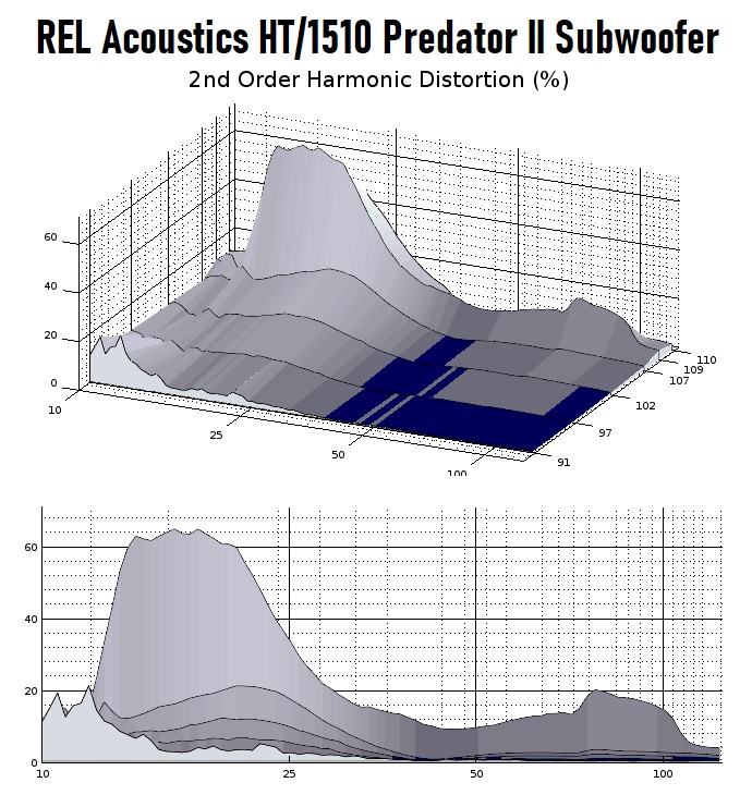 The HT/1510’s odd-order harmonic distortion is very much what we would expect from a typical sealed sub except perhaps for how extraordinarily low it is above 40Hz. Almost all of the total harmonic distortion that this sub can produce above 40Hz is even-order, but only at the highest drive level. That means at the highest drive level, there is something inhibiting only one way of travel of the moving assembly. It could be the suspension hitting some kind of tension limit for one of the directions of the driver’s stroke or perhaps the magnetic field of the motor isn’t completely symmetric out to that far of an excursion level. The good news is that second-order harmonics are the most difficult to perceive, so even the relatively high levels of harmonic distortion in mid-bass might well be inaudible or very difficult to hear.