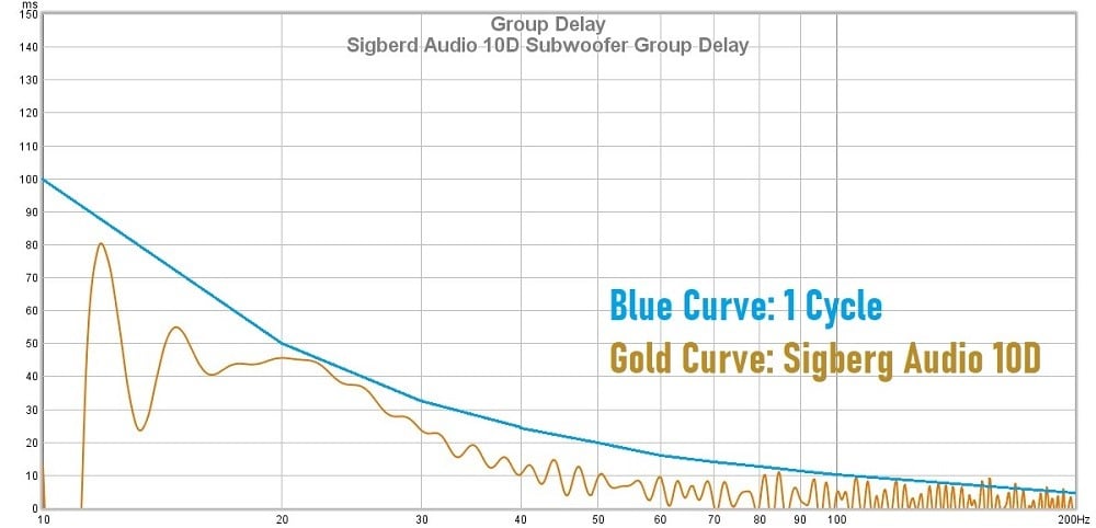 Normally I include a 1.5 cycle curve on this graph, but since the 10D does not meaningfully exceed even 1 cycle, I didn’t even bother. The 10D posts some overall very good results here, staying below 10ms above 50Hz. Group delay does start to rise a bit below 35Hz or so, and that is due to the high-pass filter that Sigberg has employed to protect the sub. It has a remarkably mild time-domain effect considering how steep its effect on the frequency response is. Overall, this is a very good showing, and this sub will have a sharp sound without any audible decay times.