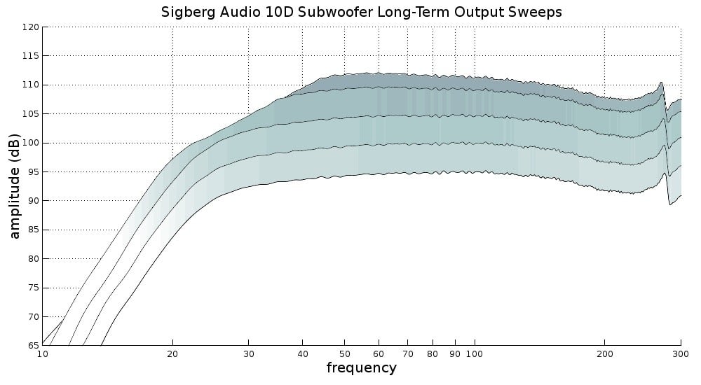 Testing for long-term output compression was done by first conducting a 20-second sweep tone where 50Hz hit 90 dB with the subwoofer 2-meters from the microphone. We then conduct further 20-second sweeps by raising the gain by 5dB until no more output could be wrung out of the subwoofer. These tests show us the long-term continuous headroom that the subwoofer is capable of. At the highest drive levels, the 10D does encounter some compression from about 25Hz to 40Hz, but it is relatively mild compared to most subs. This sub holds its beautifully flat response at all but the highest drive levels. At mid-bass, it can hold a continuous 110dB which, again, one would expect from a high-powered 12” or a typical 15”. Again, this is not the output one would expect from such a small sub.