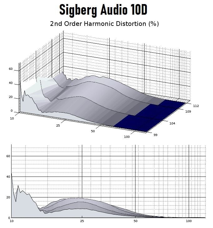 An interesting feature to note with these graphs is that the even-order distortion rises with a pretty steady rate relative to drive level, but the odd-order harmonics stay extremely low until the highest drive level at which it skyrockets in deep bass. I would guess from that kind of distortion profile that the source of even-order harmonic distortion is primarily from induction which tends to scale evenly with output level. Induction can cause an asymmetry in the back-and-forth motion of the driver. What minuscule distortion that occurs in mid-bass comes from the even-order harmonics. An advantage here is that even-order harmonic distortion is more difficult to perceive than odd-order, and so in the music frequency band, what little distortion exists is a less intrusive sort. Once the driver nears its limits, we can see from the 3rd harmonic graph that both directions of travel get evenly impacted by a restriction in its excursion.