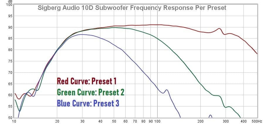 Testing on the Sigberg Audio 10D was conducted with the microphone facing the woofer at a 1-meter distance and then scaled back to 2-meters in our graphs by subtracting 6dB in output. The temperature was recorded at 49F degrees with 70% humidity. The subwoofer’s gain was set to maximum and the low pass filters were left off.