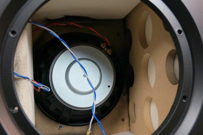 The cone itself is made from aluminum and has a large glass fiber dustcap. Aluminum is a bit heavier than some alternative cone materials that could have been used, but it does have the added benefit of serving as a good heatsink. It attaches to the basket via a thin and light NBR half-roll surround that should provide a lot of travel before any serious tension sets in. The basket itself is a heavy-duty cast-aluminum piece that definitely will not flex in the slightest against anything the moving assembly could do. The motor uses a stack of two magnets for a combined thickness of 1 ⅜” with a 5 ¾” diameter, although those figures aren’t all that meaningful without knowing the magnetic flux they produce in the gap. I would guess they would provide a great deal of force, since this driver doesn’t appear to be using a huge coil to drive the moving assembly and would therefore be relying more on the magnets to provide force. Again, this is another good strategy to reduce inductance. The motor uses a 2” diameter voice coil around a titanium former. The heat conductivity of titanium isn’t very good, but it is light and is only weakly magnetic so it won’t interfere with the magnetic field of the motor very much. Venting of the motor is done in the basket under the spider. The backplate is slightly bumped out to allow for greater excursion without hard bottoming of the former.