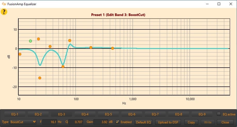 The amp has a balanced XLR input and throughput, as well as left and right RCA inputs. There are also high-level inputs for those who want to connect it to a system via speaker wire. The amp also has a USB input with which its DSP functions can be accessed from a Windows PC, and Sigberg provides the USB Mini-B cable with which to connect the sub to the PC. There are three preset configurations that can be accessed from the amp controls: Preset 1 removes the low-pass filter so the sub can be used with external bass management. Preset 2 sets the sub up to be used with the Sigberg Audio SBS.1 speakers by lowpass filtering the subwoofer at 100Hz. Preset 3 lowpass filters the sub at 40Hz and is intended to simply shore up the lowest octave in systems that have no bass management. Included in the software is a 9-band parametric EQ, so the inevitable deformation that in-room acoustics does to the response can compensated for to a pretty fine degree. Of course, it is always good practice to address peaks with equalization and dips with placement, and, if it can be accommodated, a multi-sub system. Other aspects of the sub that can be adjusted are individual input gain, input level for wake-up, time to enter standby after no signal detection, LED brightness, among others.
