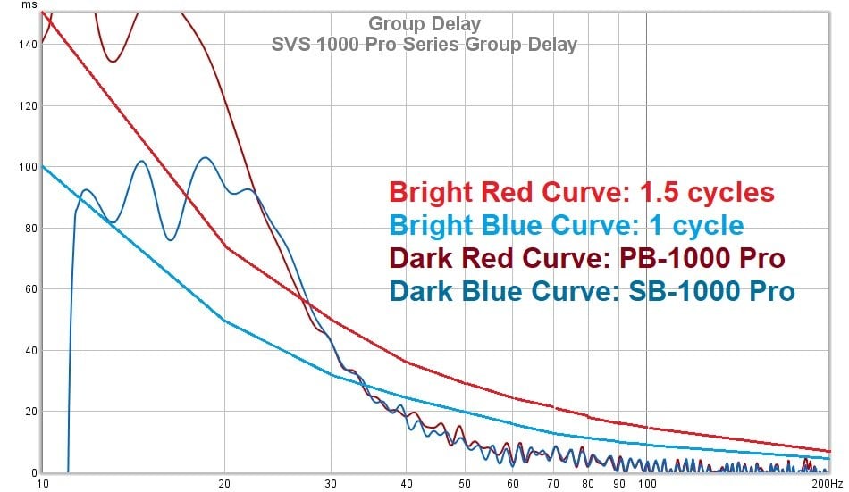 Group delay is the measurement of how much time it takes for individual frequency bands of an input signal to be produced by the speaker. It can indicate that some frequency components are developing slower than others or are taking longer to decay. It is generally thought that 1.5 sound cycles are needed for group delay to be audible at bass frequencies, although there is an argument that group delay should remain under 20 ms to be completely unnoticeable, but that is likely meant for mid and upper bass frequencies. Both the SB-1000 Pro and PB-1000 Pro keep very low group delay where it matters, in the mid-bass frequencies. The protective filters, as well as the PB-1000 Pro’s port, do hike group delay up by quite a bit below 40Hz, but those are such deep frequencies that the audible consequences are negligible. Human hearing is just not very sensitive at deep bass, but it is very sensitive to upper bass, and there are no serious time-domain problems where it could be of consequence. One interesting aspect seen here is the remarkable similarity between the measurements up to just above 20 Hz, even with the many differences between these subs. This is overall a good showing, and anyone concerned about the “quickness” of these subs really doesn’t need to be.