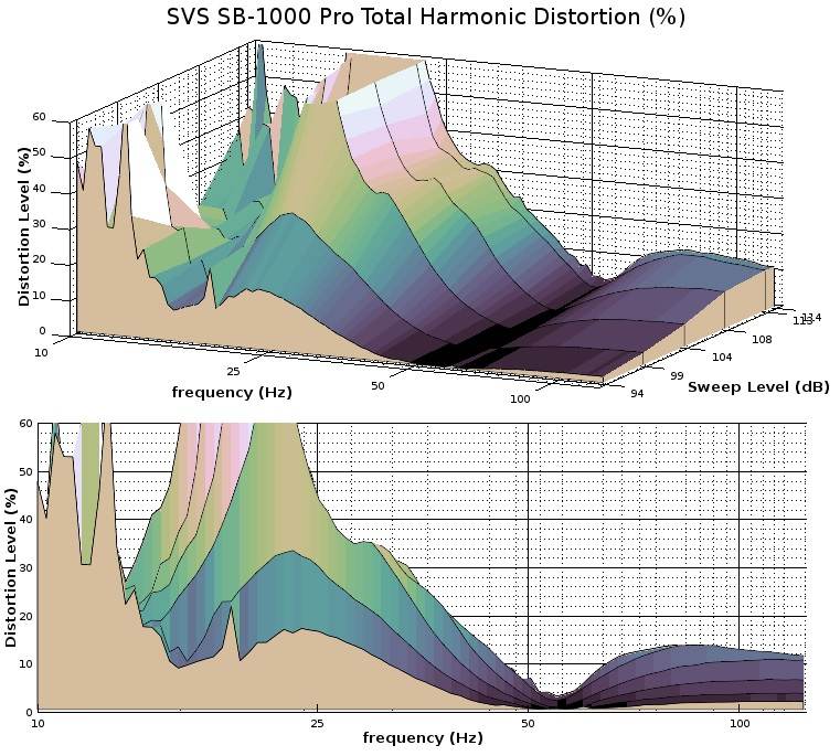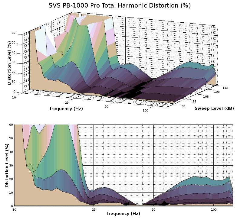 The above graphs show the corresponding total harmonic distortion to the long-term output graphs. Essentially, they depict how linear the subwoofer remains for the corresponding drive level seen in the long-term sweeps. The quantity being measured is how much of the subwoofer’s output is distortion and is shown here as a percentage. The measured performance here is fine, although SVS subs that I have tested in the past tended to have less distortion than what either of these subs could be pushed to. At nominal drive levels, distortion is very good and stays well below 5% above 20Hz on the PB-1000 Pro and 40Hz on the SB-1000 Pro. However, both subs can be pushed into pretty significant quantities of distortion at high drive levels. One interesting feature is that while the PB-1000 Pro has quite a bit more headroom than the SB-1000 Pro, it pays for that headroom with higher distortion levels. This leads me to guess that perhaps the upper bass headroom on the SB-1000 Pro may have been deliberately reduced to give it a cleaner sound for music, whereas the PB-1000 Pro was allowed as much output as could be had since it was more likely to used for film content where harmonic distortion isn’t as likely to be noticed in effects scenes such as explosions and earthquakes. The SB-1000 Pro can be pushed into a hefty level of distortion at lower frequencies, and that is expected since the entire onus of air displacement rests on a 12” driver with 13mm of Xmax, and that will reach its limits relatively early in deep bass below 30Hz.