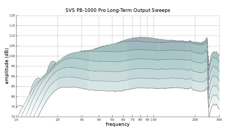 Testing for long-term output compression was done by first conducting a 20-second sweep tone where 50 Hz hit 90 dB with the subwoofer 2 meters from the microphone. We then conduct further 20-second sweeps by raising the gain by 5 dB until no more output could be wrung out of the subwoofer. These tests show us the long-term continuous headroom that the subwoofer is capable of. Again we see very good mid-bass headroom from both the SB-1000 Pro and PB-1000 Pro, with the PB-1000 Pro nearly touching 110dB at 80Hz and the SB-1000 Pro surpassing 105dB from 50Hz to 90Hz. This is the range for a lot of bass drum percussion so these subs should have a nice punch for that instrument. One thing that is interesting to note is that the PB-1000 Pro seems to have a considerable advantage in upper bass as well as deep bass versus the SB-1000 Pro. I would have expected a deep bass advantage, but the PB-1000 Pro has a very significant headroom gain above 100Hz over its sealed sibling. At the highest sweep of the PB-1000 Pro, we do see some hiccups in the response, and that would be the attack and release of the limiter kicking in to restrain the subwoofer from beating itself to death. Aside from the extra headroom of the PB-1000 Pro in upper bass, these measurements are about what would be expected and are a very good showing from SVS, especially in this price class.