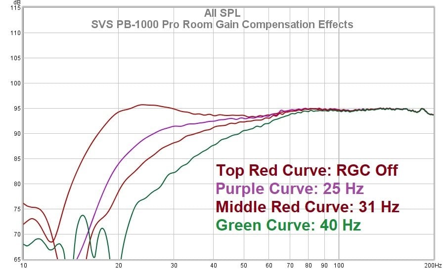 The above graphs depict the changes on the response that can be made by the Room Gain Compensation settings. Smaller rooms can boost deep bass substantially thereby making it sound ‘tubby.’ If you don’t like the low-end boost that can be caused by room gain, SVS has provided these simple settings that should do the trick in taking down deep bass without having to tinker around in the PEQ to get the same result.