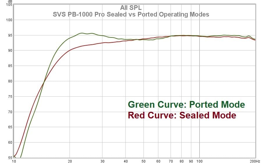 For those who are curious, here is the response difference that occurs when you seal the ports of the PB-1000 Pro and set it to the ‘Sealed’ operating mode in the SVS app. With the inclusion of the ‘Room Gain Compensation’ EQ settings in the app, there isn’t really a good reason to use this sub in a sealed operating mode, ever. If you are getting too much room gain that is blowing up the low-end of the response, use the Room Gain Compensation settings to change the low end. Sealing the ports does taper off the low-end a bit but robs the user of headroom in doing so; the Room Gain Compensation settings temper the low end without the headroom penalty.