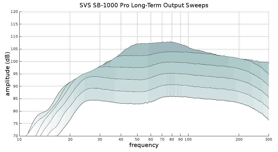 The above CEA-2010 measurements are short-term bursts that show the subwoofer’s clean peak SPL before heavy distortion sets in. Our measurements have been referenced to 2-meter RMS, which is 9 dB down from the standard requirement for the measurements to be shown at 1-meter peak. However most publicly available CEA-2010 measurements are shown at 2-meter RMS, so we followed that convention. The measured performance from both the SB-1000 Pro and PB-1000 Pro are superb for their price. In fact, the PB-1000 Pro matches the PB-2000 Pro for mid-bass output at 50Hz and above. It looks to be a big jump in performance over both the original 1000 series as well as the original 2000 series for that matter (except at 25Hz and below). The SB-1000 Pro’s performance is very good considering its size; 101dB at 31Hz is nothing to sneeze at, especially for such a tiny sub. However, the enclosure size and ports of its larger sibling put it at a very serious disadvantage for deep bass headroom. At 20 to 25Hz, the PB-1000 Pro has about a 12dB advantage over the SB-1000 Pro, which is about four times the headroom. On this point, it should be mentioned here that SVS reports that these measurements correlate very closely with their own, except for the SB-1000 Pro specifically at 20Hz and 25Hz where they measure almost 2dB more than what I was able to capture. Either way, the SB-1000 Pro is not a sub I would get for big output down in that range. It runs out of steam fairly quickly in deep bass, but that would be expected from a small sealed sub. Its mid-bass headroom is very good though, and it has plenty of headroom for almost any bass in the range of acoustic music recordings.