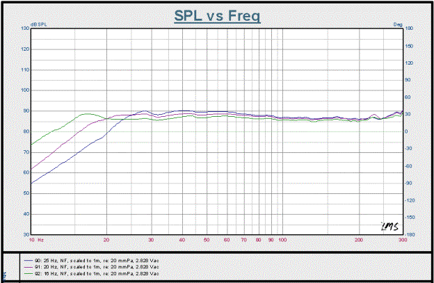 Figure 5 shows the PB12-Plus/2's amplitude response curves for the 25 Hz (Blue), 20 Hz (Purple) and 16 Hz (Green) system tunings. The drive level was 2.828 Vac and measurements were taken nearfield, subsequently scaled to 1m. For these measurements the crossover network and parametric EQ were both disabled, phase = 0°. All measurements were done indoors. Keep in mind that the nearfield measurement technique effectively excludes the measurement-skewing effects of the room within which the unit is being measured, therefore actual dB spl levels attained in practice are much higher, owing to room gain.