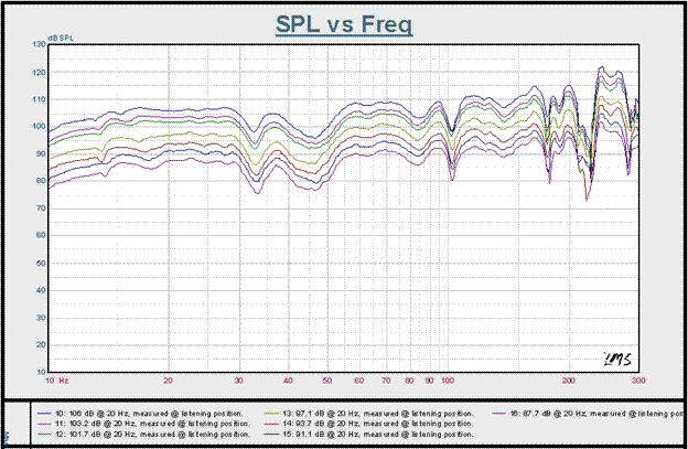Figure 6b: In room (non-gated) response as measured at the main listening position; 20 Hz system tuning, sweeps increased at ~ 3dB increments, starting at 87.7 dB (@ 20 Hz).
