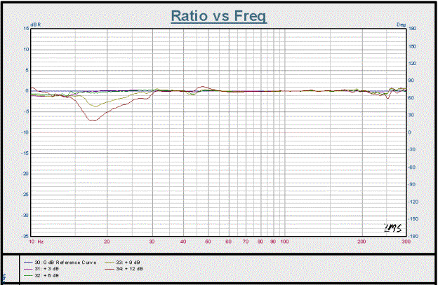 One particularly noteworthy feature found in the measurements is that the amplitude response in the 16 - 30 Hz segment of interest is that it grew flatter as the dB spl output increased.