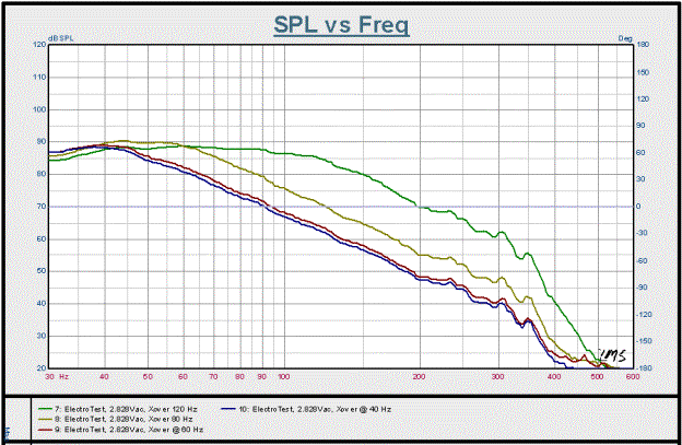 Figure 10: Electronic lowpass filter; fc = 120, 80, 60, and 40 Hz, measured nearfield, scaled to 1m, 2.828 Vac drive level.
