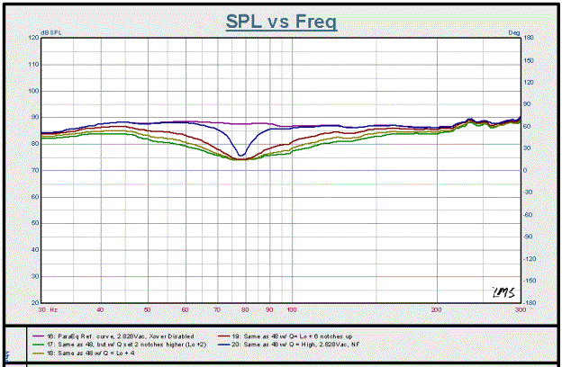 Figure 11: Parametric EQ, variable Q function, 2.828Vac drive level, scaled to 1m.