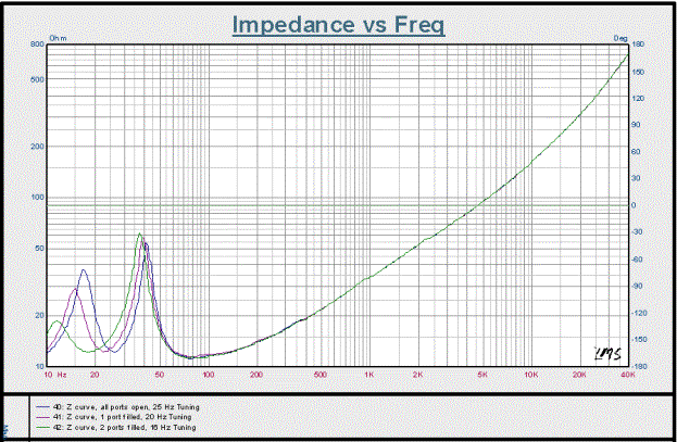 Impedance curves are useful in diagnosing pathologies such as strong mechanical resonances, defective drive units, etc. They're also useful for getting a fairly accurate view of the systems tuned resonance frequency. In this case, the impedance minima appearing between the two z peaks were within a couple of Hz of the stated tuning frequencies listed in the manual (16 Hz, 20 Hz and 25 Hz).