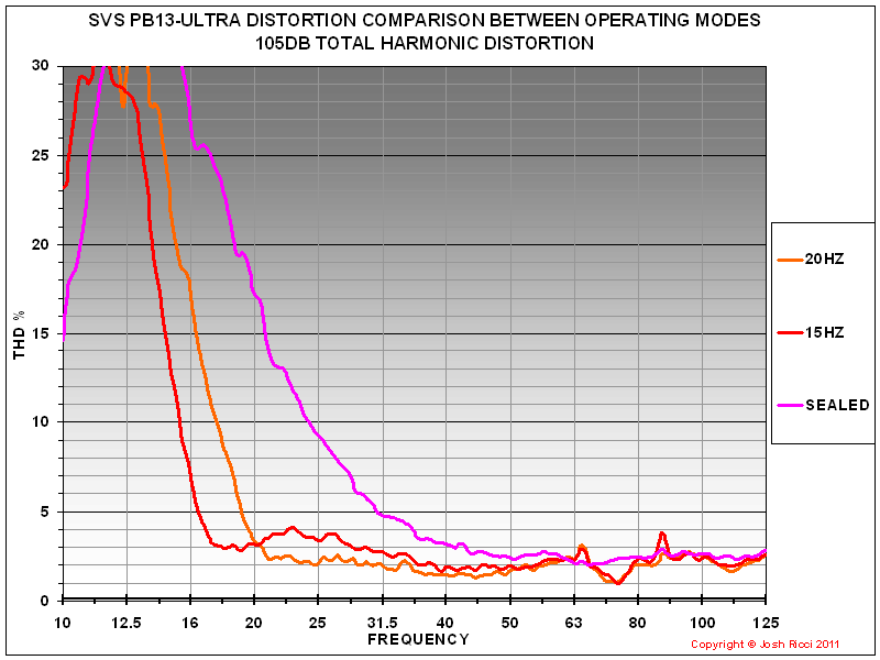 SVS PB13-Ultra: 105db Sweep THD Comparison (20Hz, 15Hz and Sealed Mode)