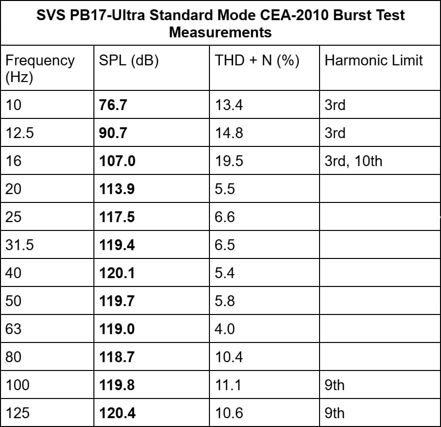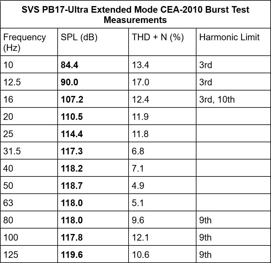 The above table shows our CEA-2010 burst results for the PB17-Ultra in Standard Mode. Again, we see monster SPLs being produced by the subwoofer across the board. Oddly, the deep bass output of Standard Mode seems to be on the level of Extended Mode. However, Standard Mode isn’t quite as clean in terms of distortion when pushed to the edge in those lowest frequencies, and that is not surprising.