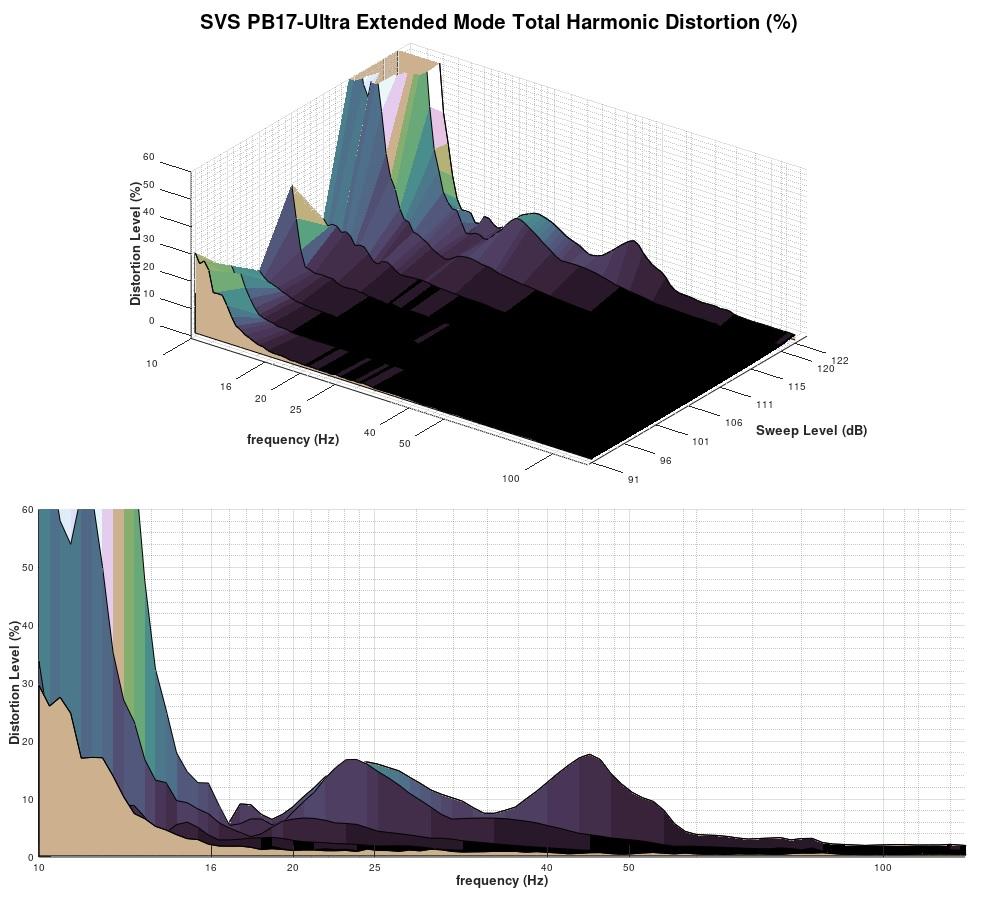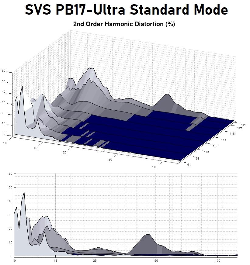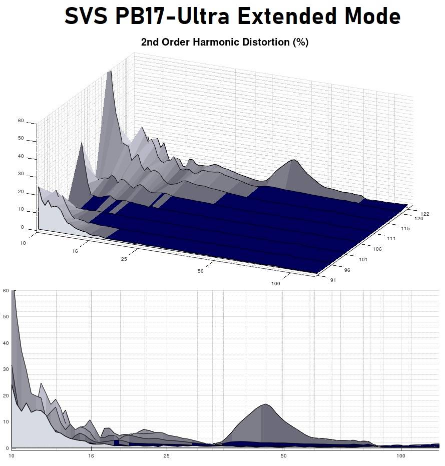 There isn’t anything all that unusual about the harmonic composition of the PB17-Ultra’s distortion. One item to note is how the second harmonic spikes just under 50Hz at the highest drive level. I am not sure what to attribute that to, but I don’t regard it as a serious problem. One thing to note is the lack of even-order harmonics at lower levels; to me, that indicates that SVS has managed to keep inductance effects under control, which is surely a challenge with so much voice coil.