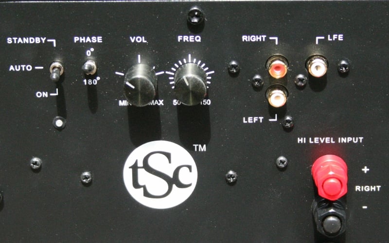 present. Phase switch (0-180 degrees), stereo RCA and LFE inputs and high level