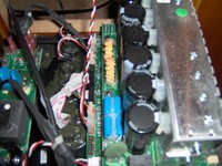 Removing the grill cover, black gloss-finish fascia and driver revealed a moderately damped, well sealed cabinet built up of 1” (2.54 cm) panels. Glue blocks were used throughout. No cross bracing of any kind was used in construction of the cabinet. Driver and fascia held in place using Allan-bolt/t-nut mounting hardware. Both driver & amplifier openings are gasketed. The system rests upon 4 ¼-20 threaded aluminum feet with rubber inserts. They work very well in making sure the unit stays put.