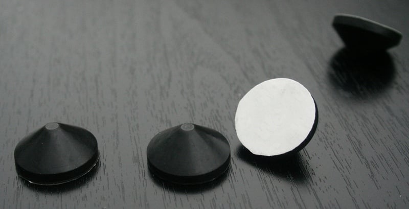 threaded inserts for feet. The provided rubber feet are conical with a sticky