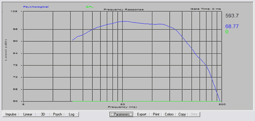To measure the subwoofer's frequency response I placed the unit outside, set the gain to the THX setting (about 1-4 volume) and bypassed the variable crossover. Using the Rives Audio Pro Test Kit, and placing the microphone at ground level approximately one foot from the woofer cone, I conducted the frequency response and SPL test as shown in the accompanying graph.